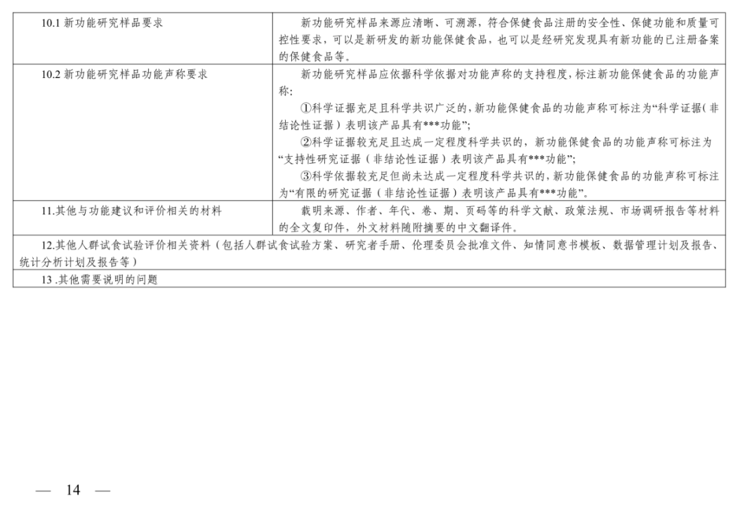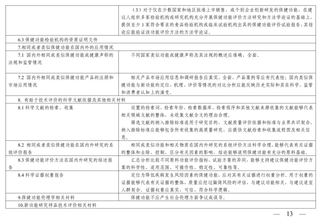 第十三條 食品審評中心按照附表中的技術評價要點組織對新功能建議材料的下列內容開展技術評價: